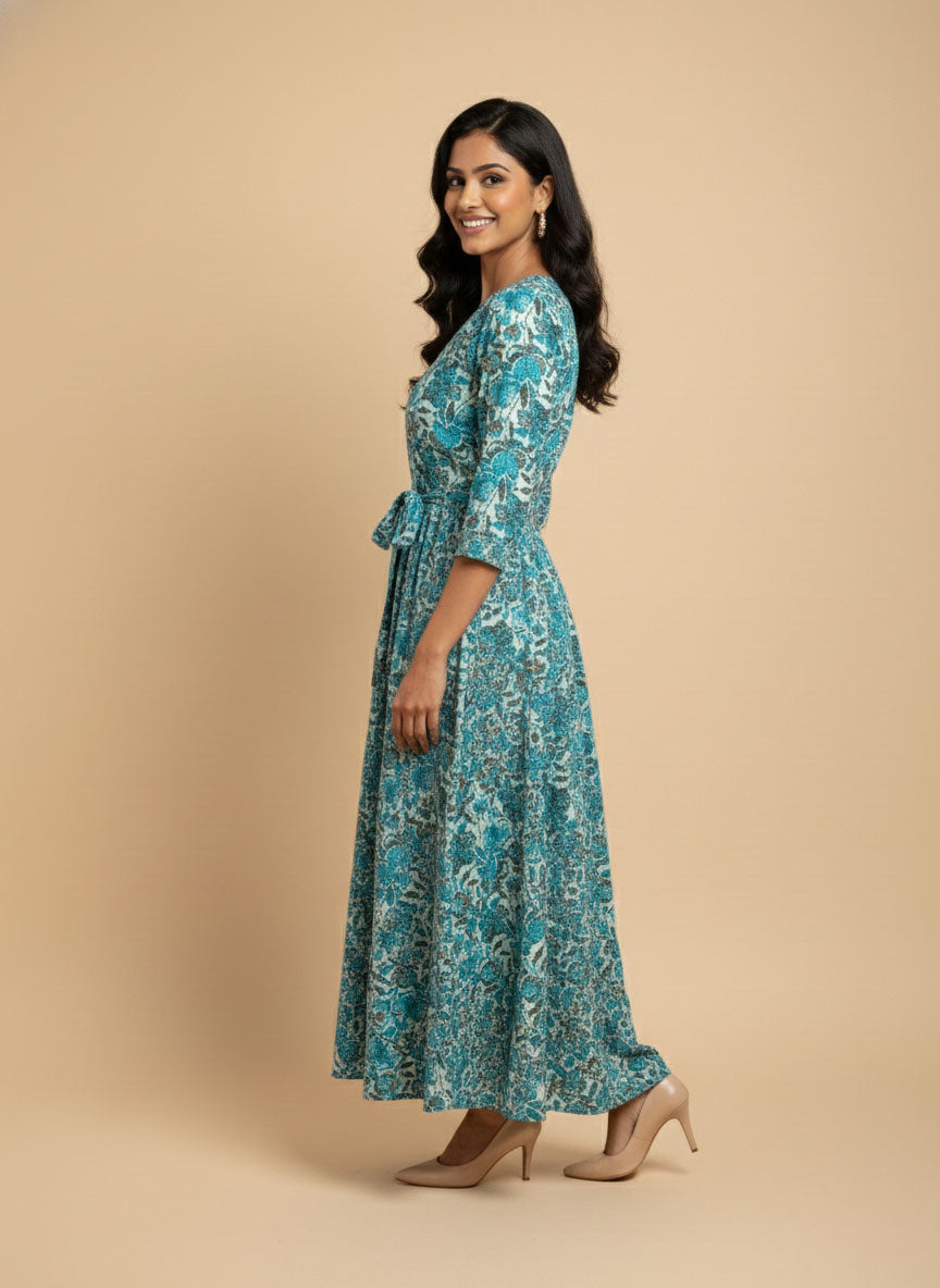The flattering Anarkali silhouette flows gracefully with every step, creating a regal yet comfortable look. Featuring a soft V-neckline, three-quarter sleeves, and a gently cinched waist with a tie detail, this dress enhances your natural shape while ensuring all-day comfort. The breathable fabric makes it perfect for festive gatherings, casual celebrations, brunch dates, and special occasions.